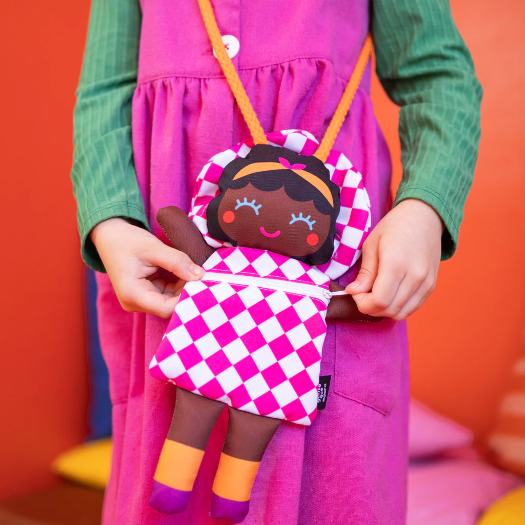 Uma bolsinha em formato de boneca cheia de charme e personalidade, com alça para acompanhar a criança em seus passeios. Super fofinha, possui zíper que facilita o uso no dia a dia, sendo perfeita para carregar brinquedos, batons, pulseiras ou colares com praticidade e muito carinho 💛