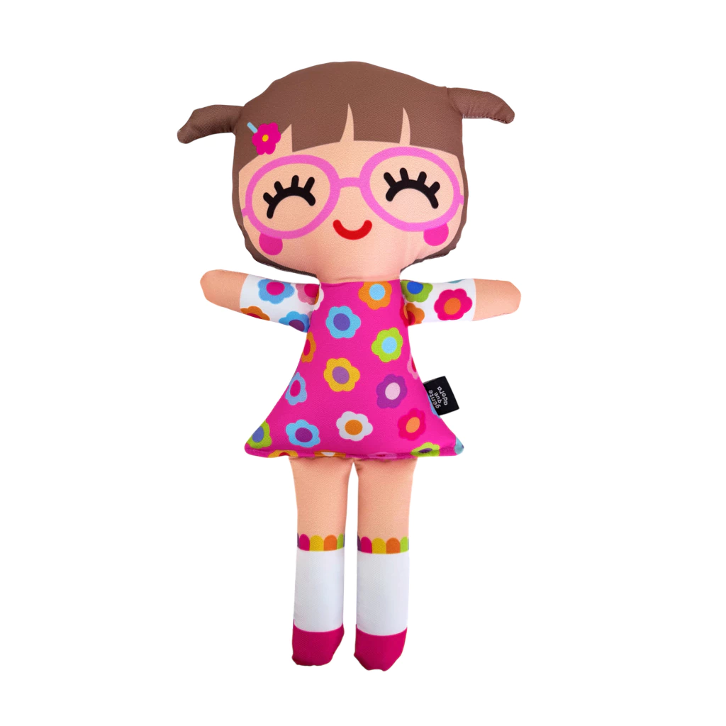 São bonecas em tecido sublimado, recheadas com fibra acrílica antialérgica e costuradas à mão por senhorinhas aposentadas que complementam sua renda através da inclusão social feita pela marca e são extremamente competentes e cuidadosas com o seu trabalho.