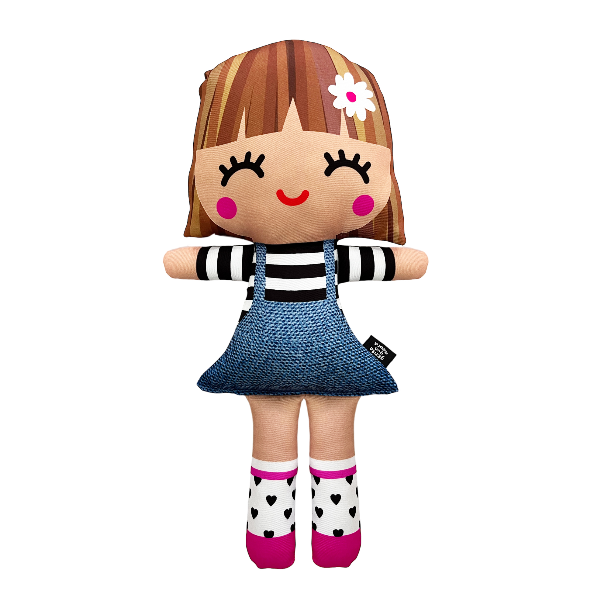 São bonecas em tecido sublimado, recheadas com fibra acrílica antialérgica e costuradas à mão por senhorinhas aposentadas que complementam sua renda através da inclusão social feita pela marca e são extremamente competentes e cuidadosas com o seu trabalho.