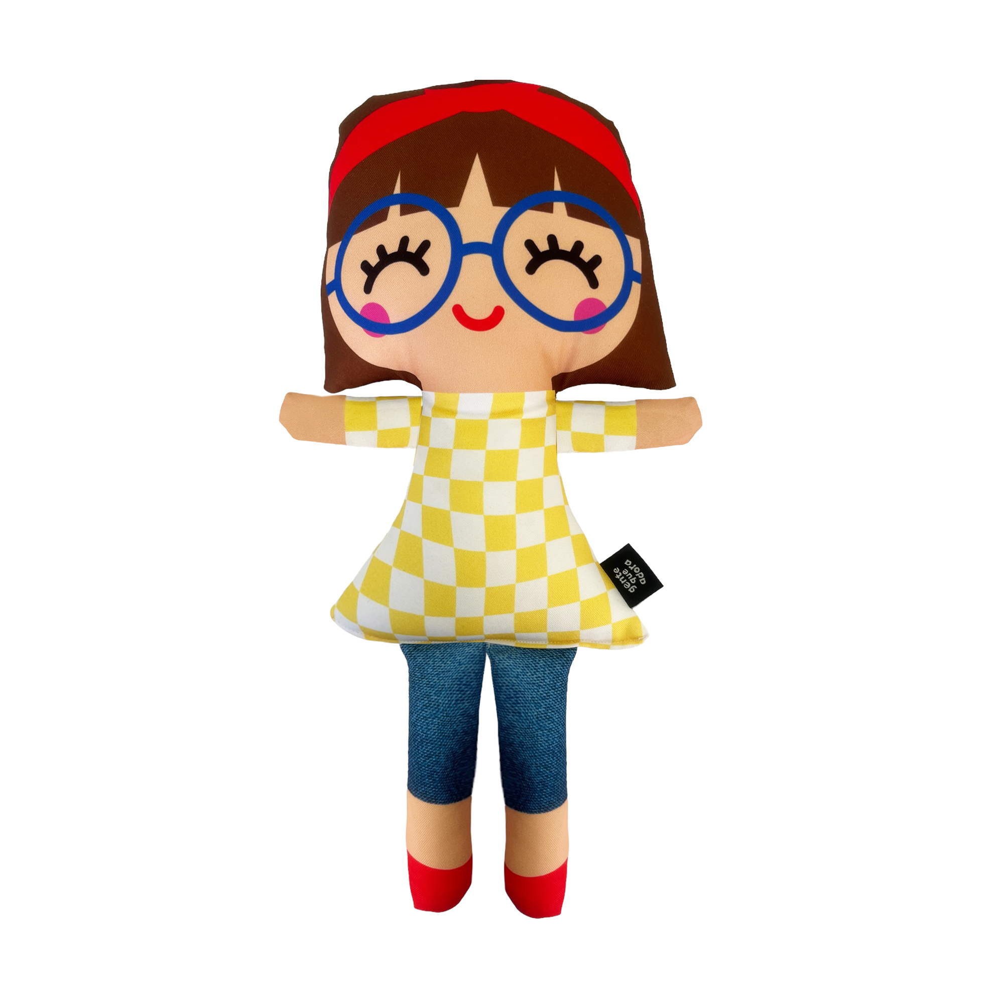 São bonecas em tecido sublimado, recheadas com fibra acrílica antialérgica e costuradas à mão por senhorinhas aposentadas que complementam sua renda através da inclusão social feita pela marca e são extremamente competentes e cuidadosas com o seu trabalho.