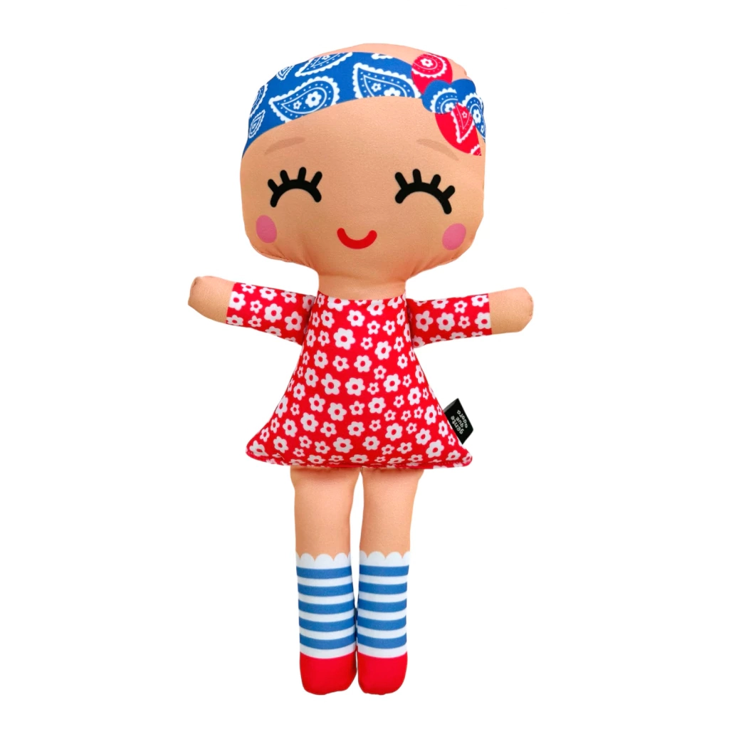São bonecas em tecido sublimado, recheadas com fibra acrílica antialérgica e costuradas à mão por senhorinhas aposentadas que complementam sua renda através da inclusão social feita pela marca e são extremamente competentes e cuidadosas com o seu trabalho.