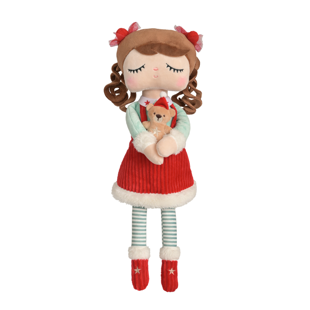 Celebre o Natal com a encantadora Boneca Com Caixa Nina! Essa fofura traz todo o charme e brilho da temporada natalina. Seus cabelinhos presos com laços natalinos, o delicado vestido vermelho em veludo, detalhes em pelúcia branca, blusa verde menta e o Ursinho Encantado em suas mãos fazem dela a companhia perfeita para esta época especial.