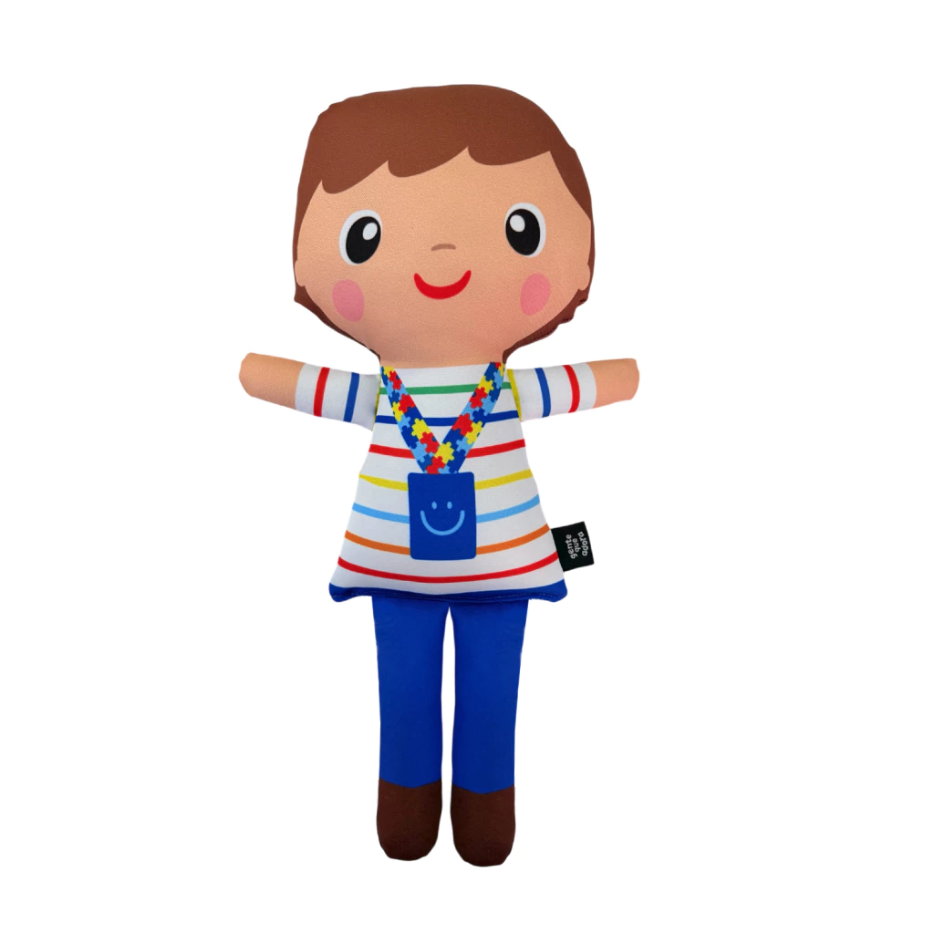 Um boneco cheia de carinho e significado, com crachá TEA, que promove inclusão, empatia e respeito às diferenças através do brincar.